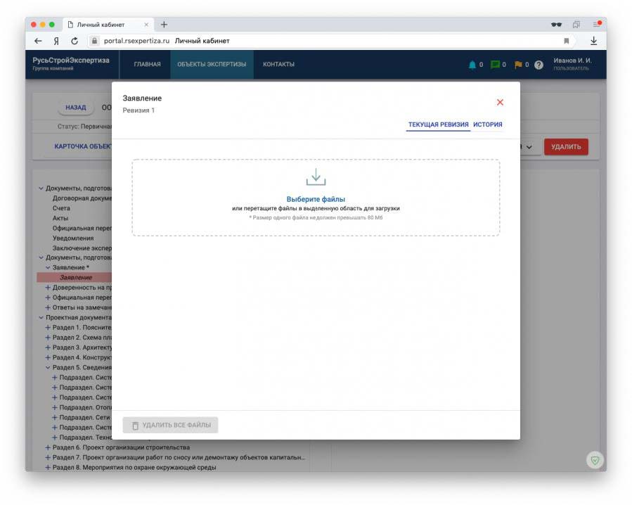Откроется окно загрузки документации. В этом окне можно либо перенести необходимый документ или выбрать его из папки. После загрузки это окно можно закрыть и серый прямоугольник станет синим.